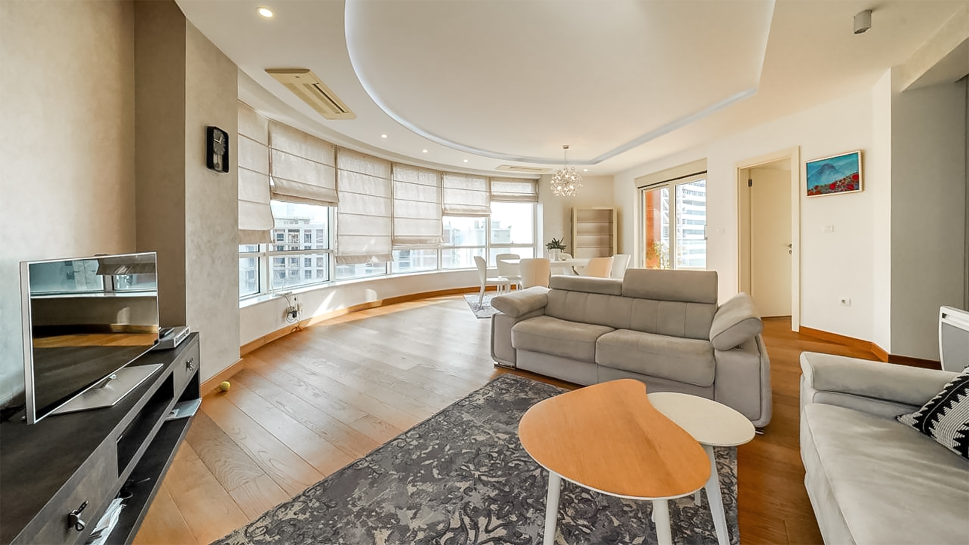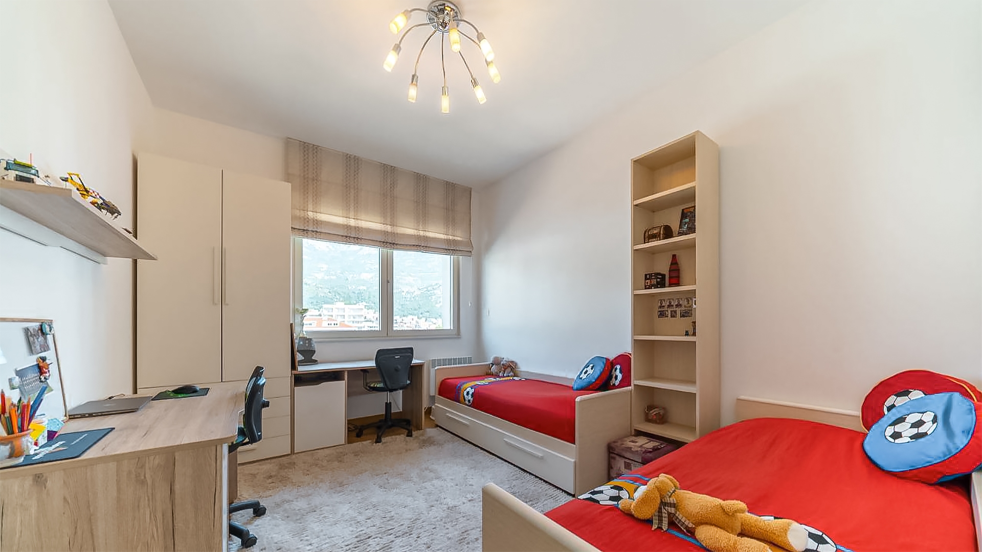 For Sale. Spacious apartment in the prestigious Admiral complex. 📍Budva city center Area: 121m². Inside: - spacious kitchen - large living room with panoramic windows and views over the city and the sea - 2 bedrooms - 2 bathrooms - terrace Facilities: - premium quality kitchen, cooker with oven and dishwasher - split system - heating system and floor heating in bathrooms - wooden floor - elevator A great option for a family. Sold with all furniture. The apartment is located on the 6th floor. 💶 Price 450.000€